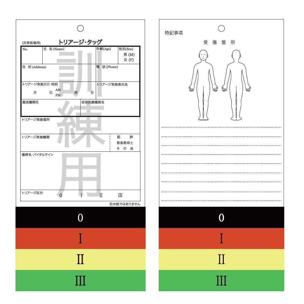 【厚生省規格対応品】「トリアージ・タッグの標準化について 指第15号 平成8年3月12日」で公表された規格に準じて作成しております。本番用として販売されている他社製品と同等の記入欄・切り取り線で、本番さながらの訓練が可能です。※防水紙ではございません。